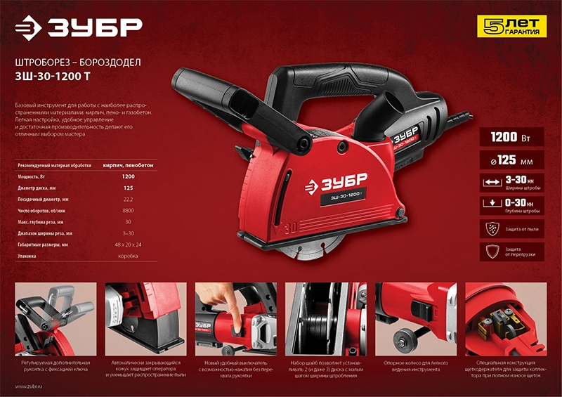Преимущества штробореза Зубр Мастер ЗШ-30-1200 Т: