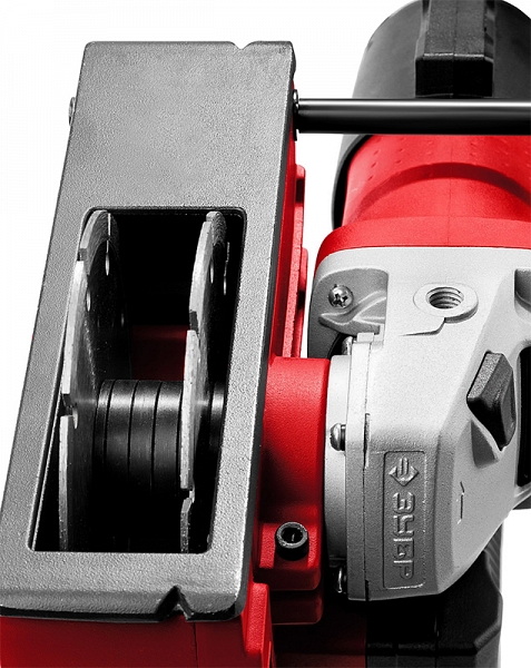 - Закрывающий зону работы подпружиненный кожух предотвращает разброс продуктов реза при любой глубине штробы